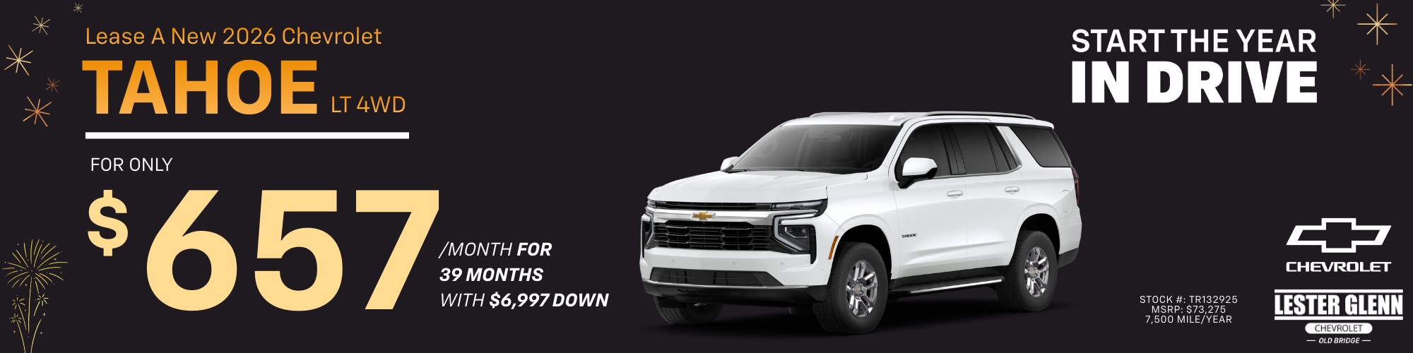 Lease a new 2026 Chevrolet Tahoe for as low as $657/mo for 39 months with $6,997 down!